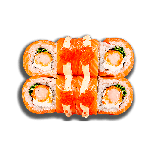 Рис, нори, сливочный сыр, креветка в кляре, лук зеленый, икра Масаго, филе лосося,соус Спайси